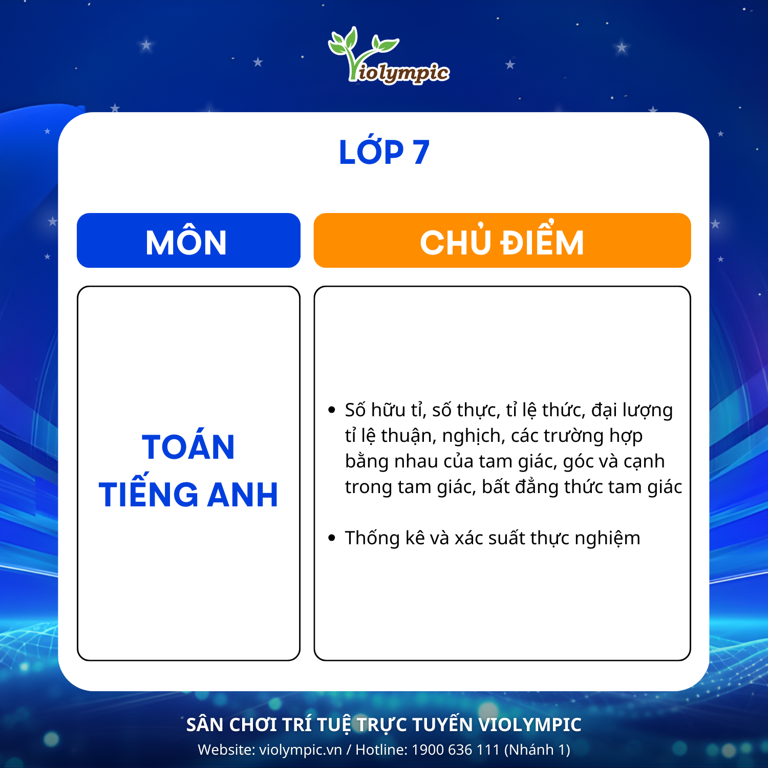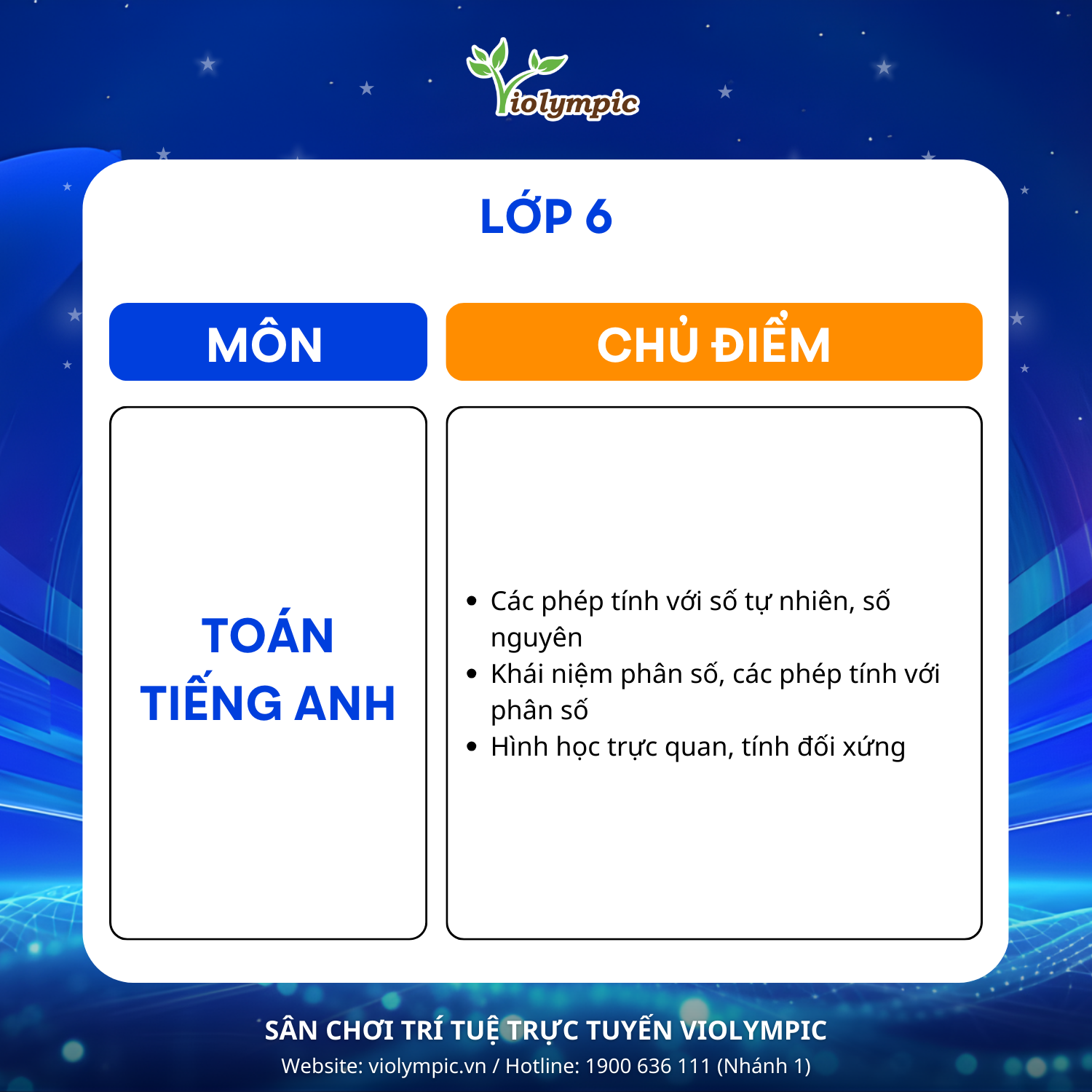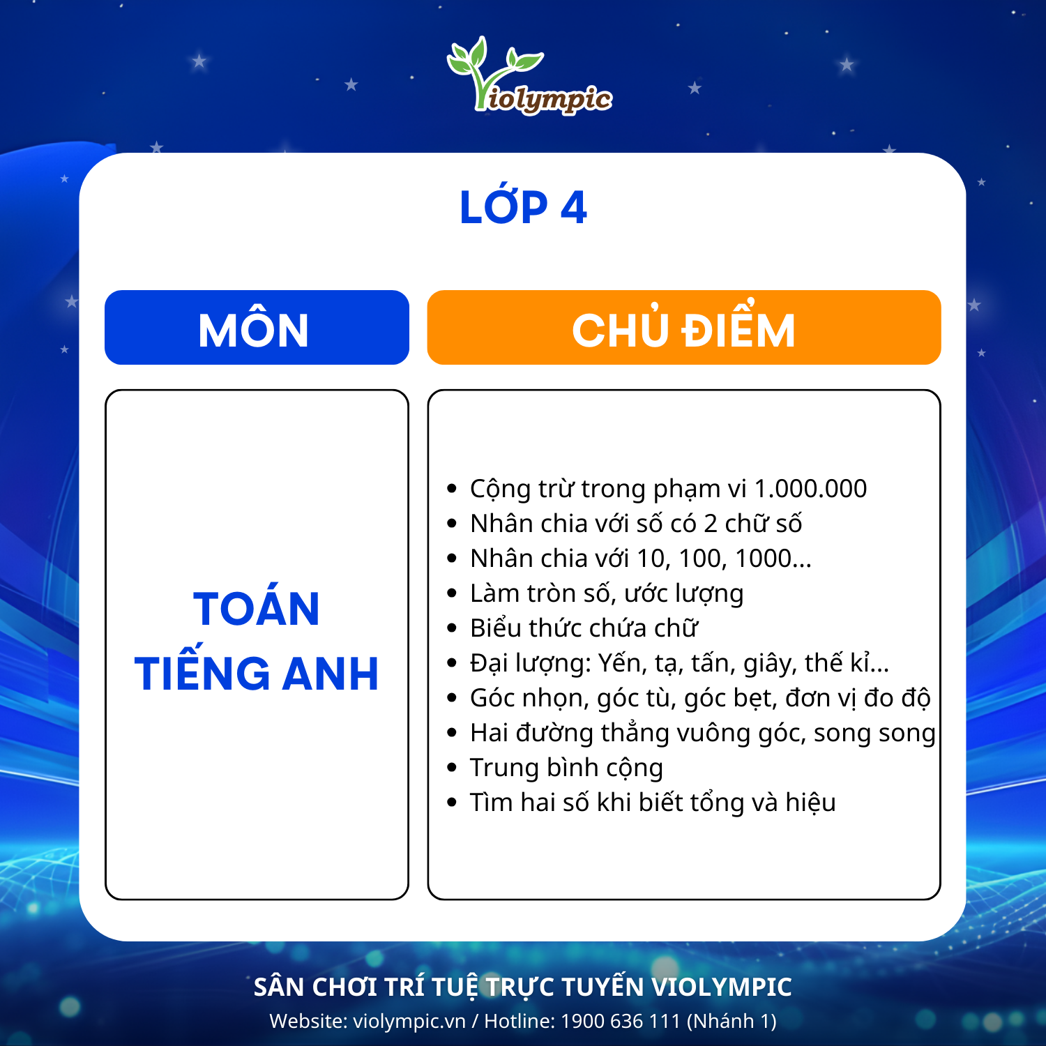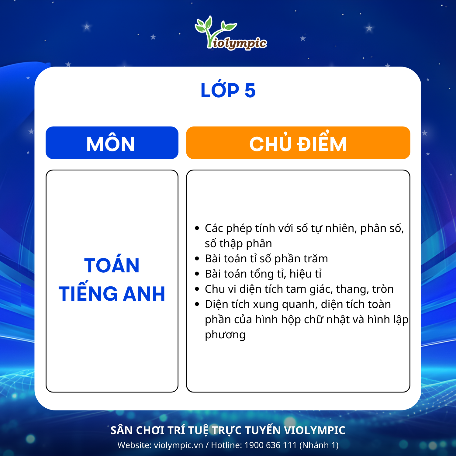 BTC Violympic Quốc gia gửi tới các em học sinh các chủ điểm ôn tập môn Toán Tiếng Anh vòng thi Quốc gia năm học 2025 – 2026.