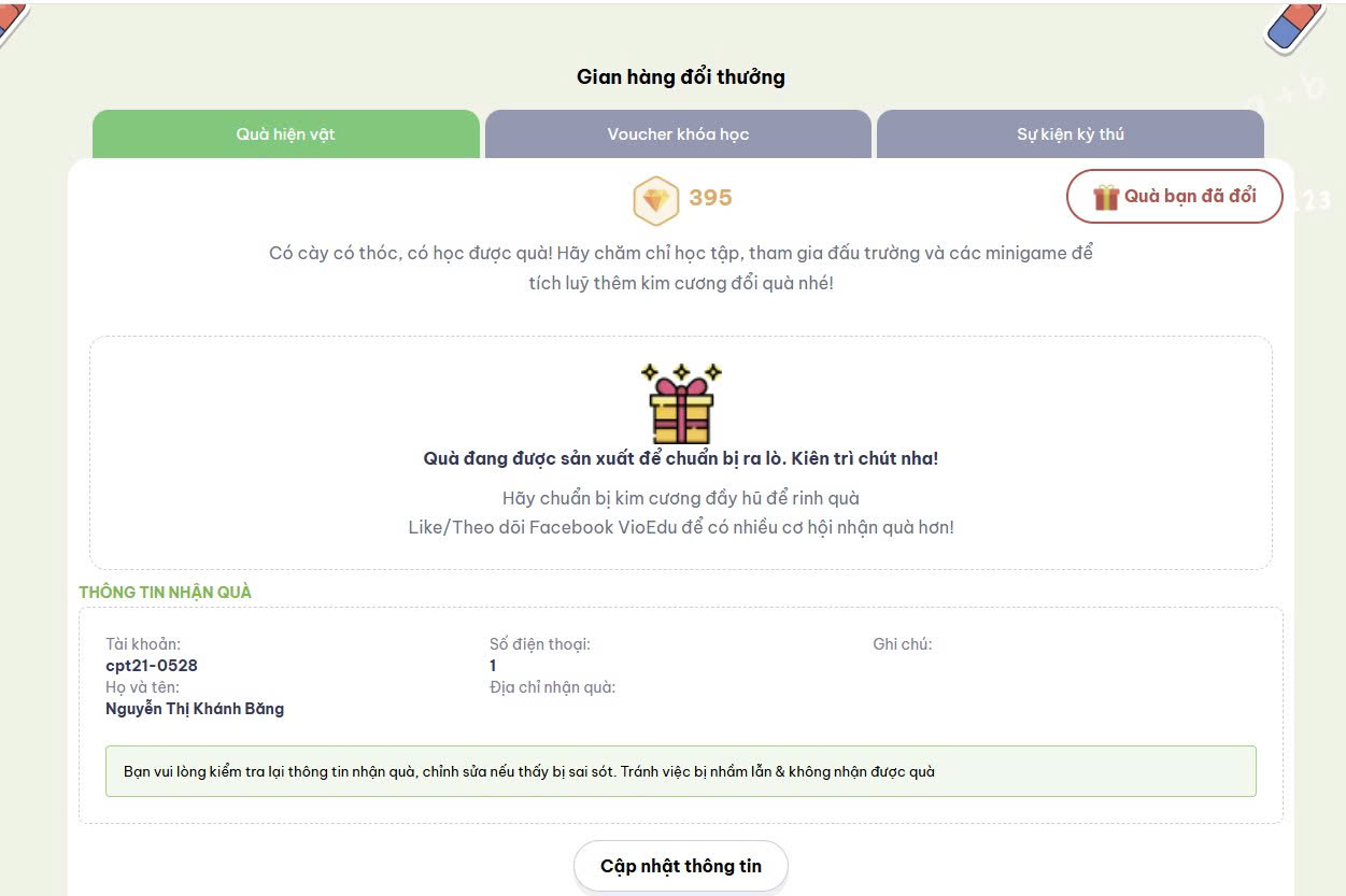 Nhấn “Nhận ngay” để xem chi tiết phần thưởng. Đối với các phần thưởng trực tuyến như Giấy chứng nhận online, avatar, danh hiệu, huy hiệu và kim cương, hệ thống VioEdu sẽ tự động cộng trực tiếp vào tài khoản của học sinh. Đối với quà hiện vật, học sinh cần cập nhật địa chỉ nhận quà theo các bước sau: Chọn “Xem quà” -> Nhấn “Cập nhật thông tin”-> Điền đầy đủ các thông tin gồm: Họ và tên người nhận, số điện thoại, địa chỉ nhận quà.