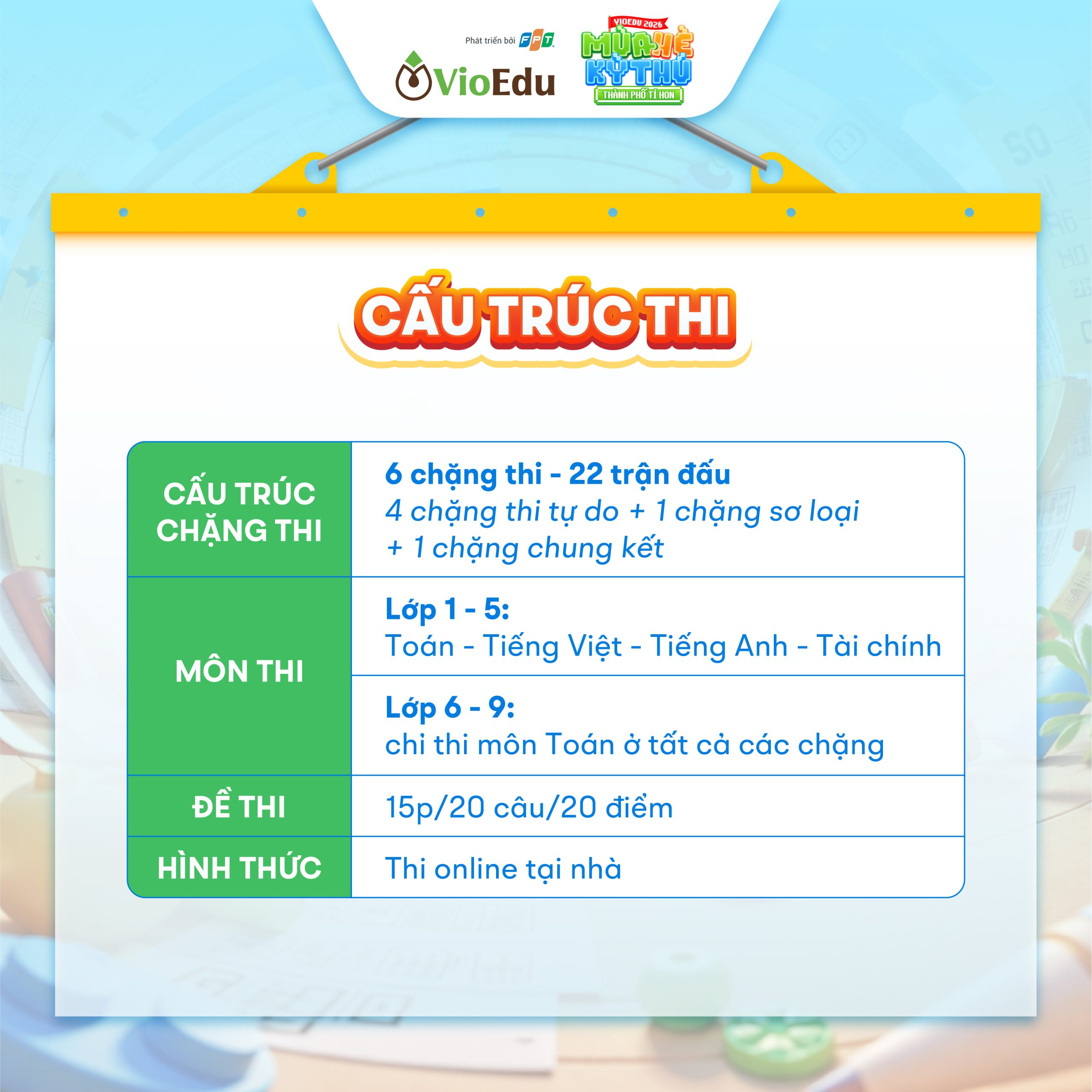 • Hình thức tham gia: Thi trực tuyến qua website vio.edu.vn hoặc ứng dụng VioEdu trên máy tính, điện thoại, máy tính bảng.