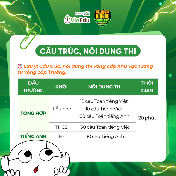 – Hình thức: Thi trực tuyến trên hệ thống vio.edu.vn bằng tài khoản đã được cấp. Các trường chủ động phương án giám sát, ghi hình quá trình làm bài để đảm bảo tính minh bạch theo quy định của BTC.